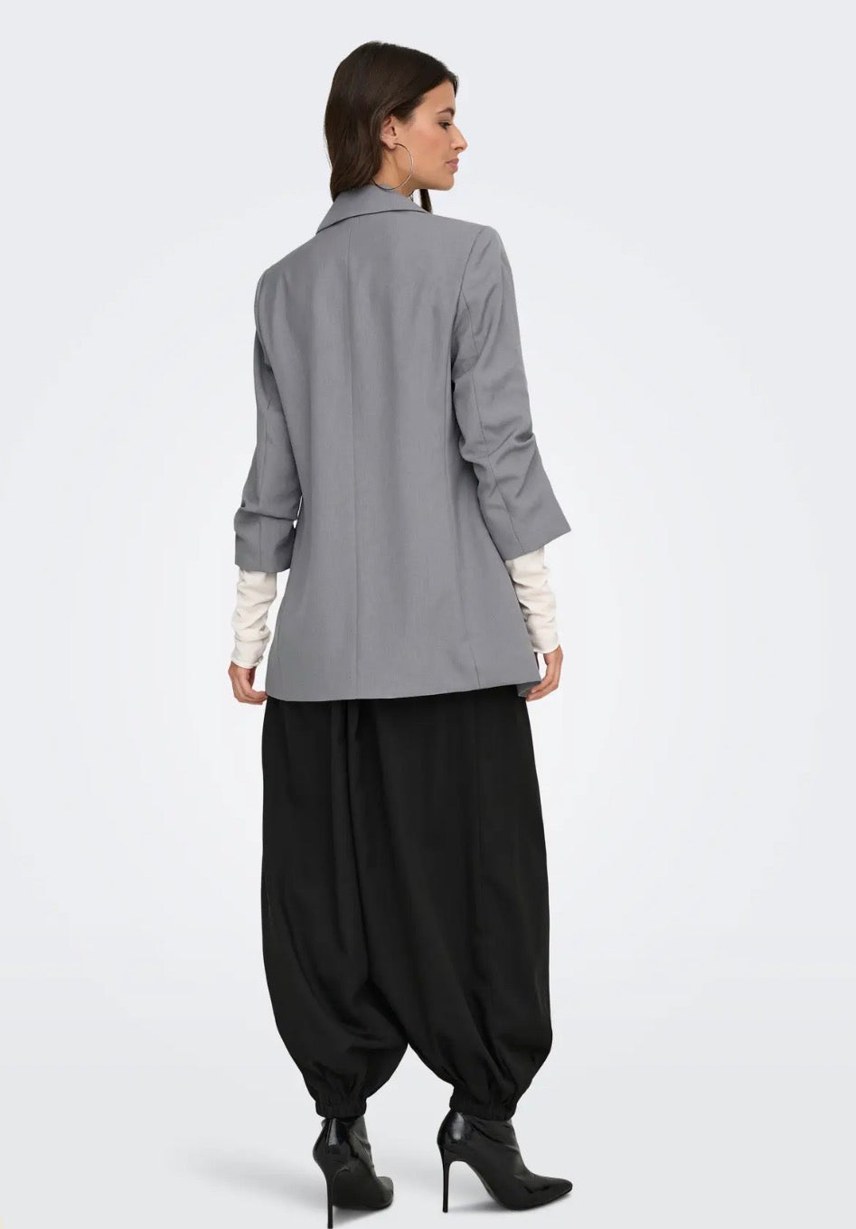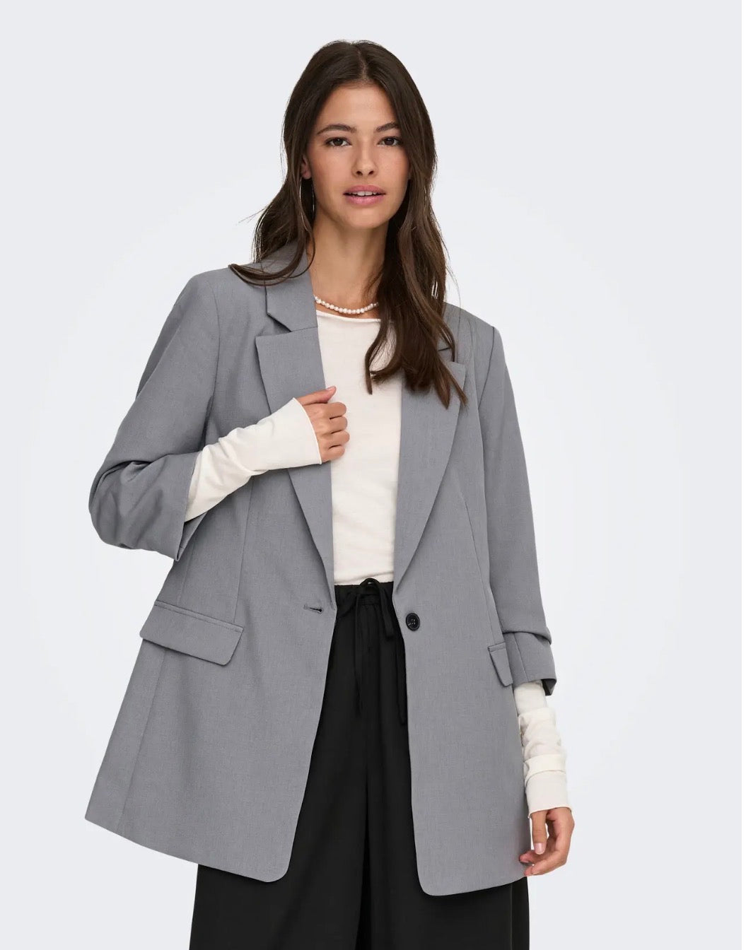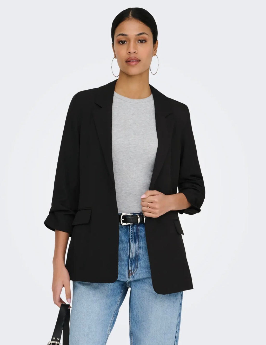 Americana de largura media, ligeramente entallada, con hombreras, manga recogida y forro interior. Ligera y muy estilosa.