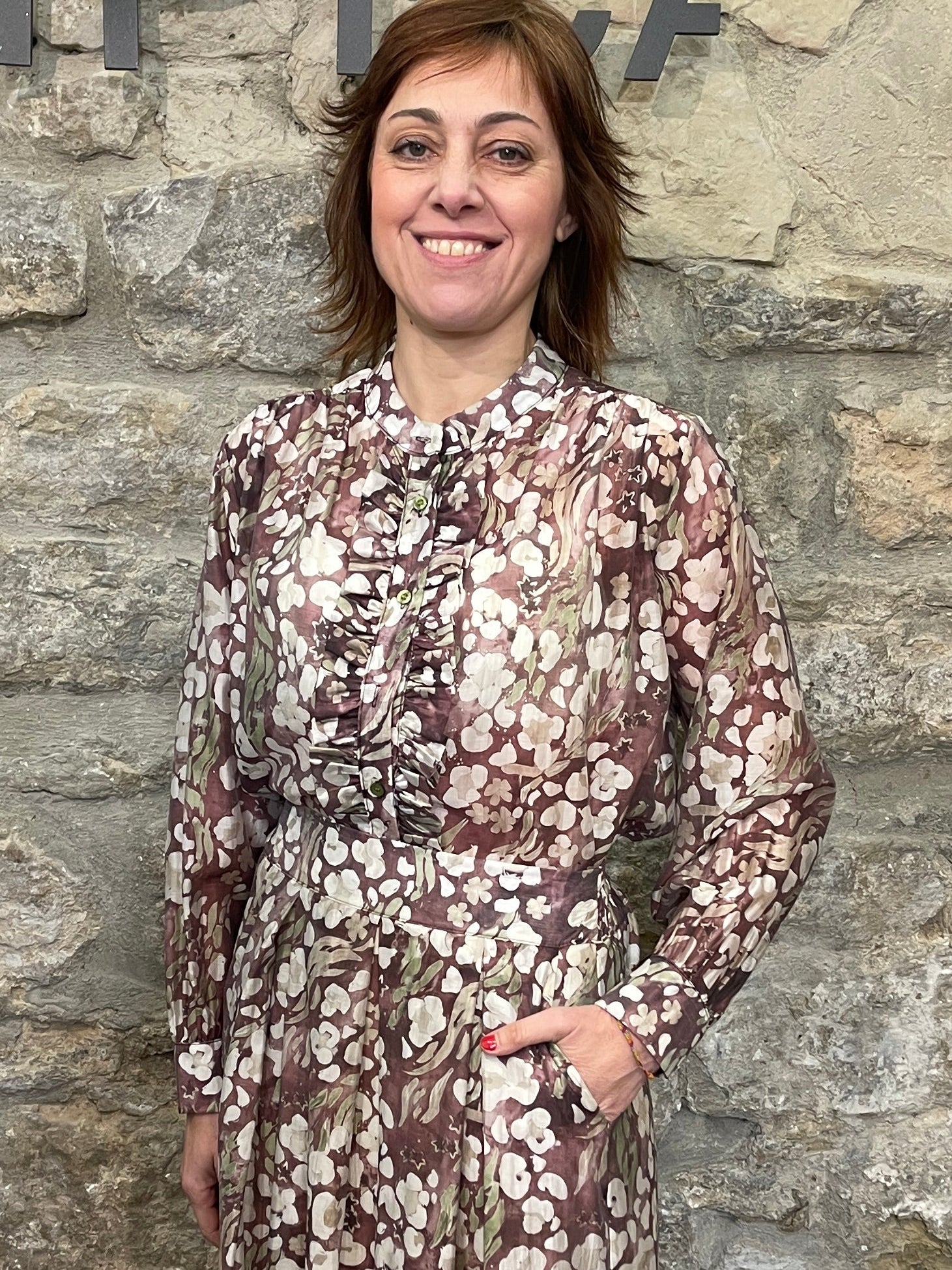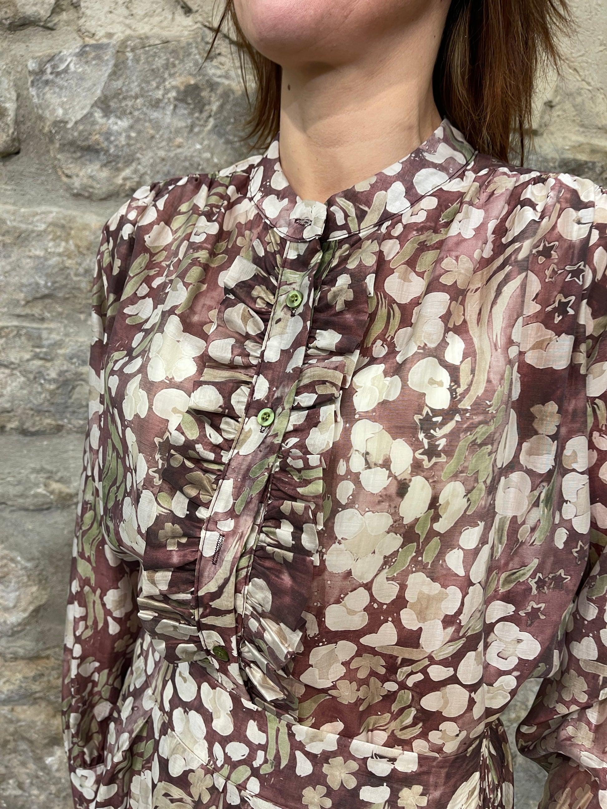 Camisa estampada con volantes y cuello mao.
