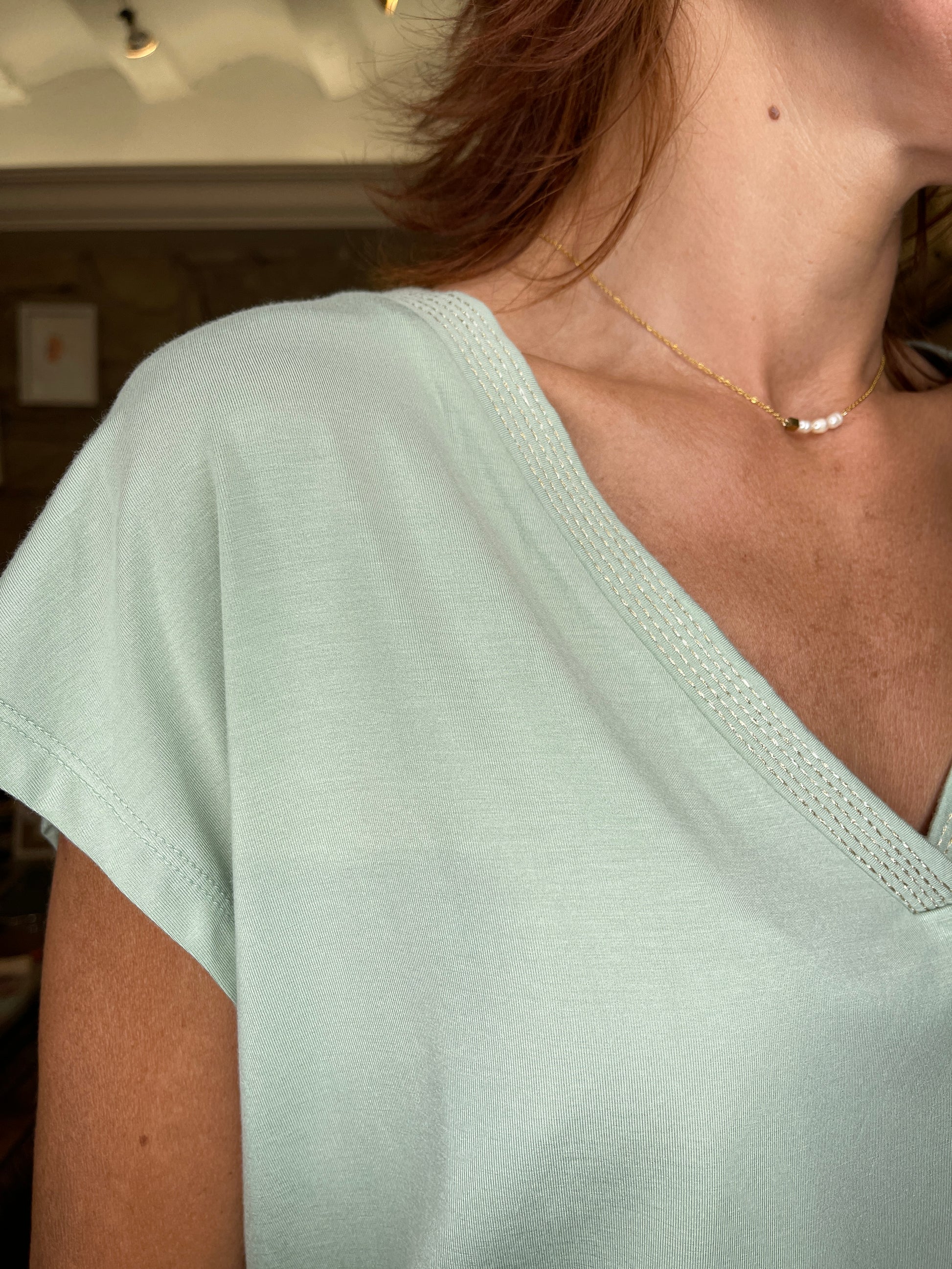 Camiseta de cuello pico, con detalle de hilo lurex. Tacto brutal.