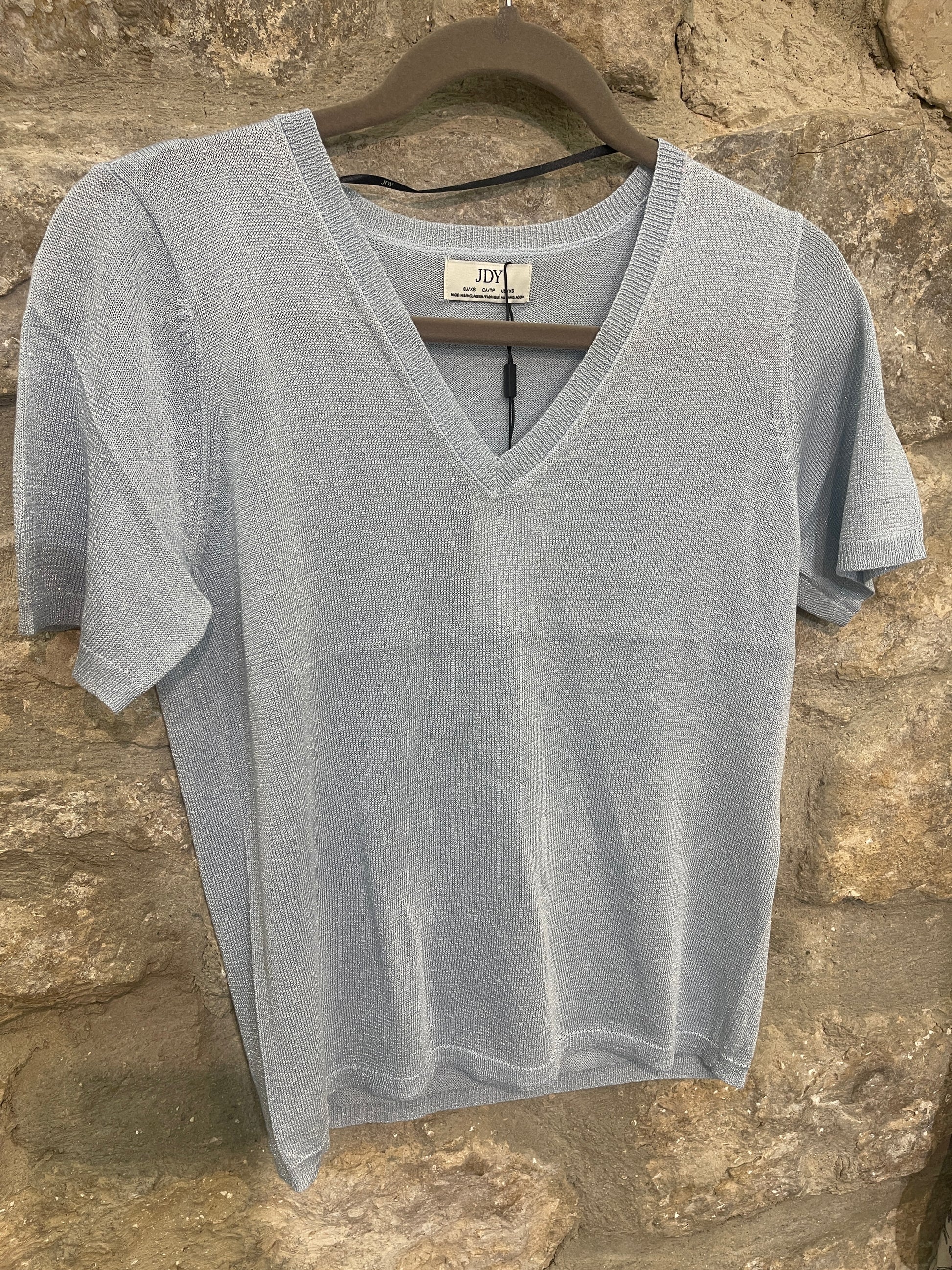 Camiseta de maga corta, con punto lúrex y escote en pico. Tejido suave y confortable.