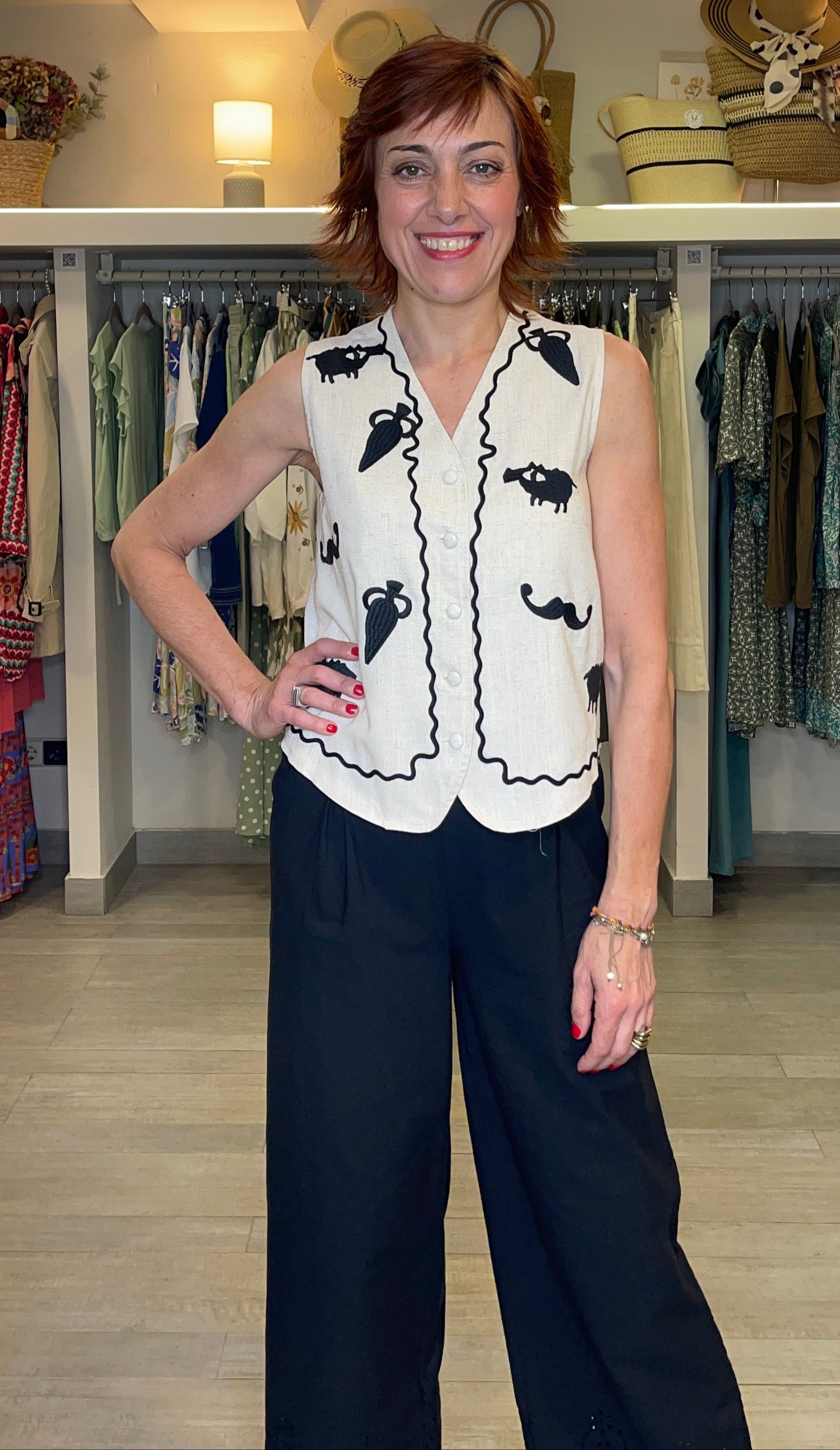 Chaleco en lino con bordados en negro simulando grabados egipcios.
