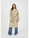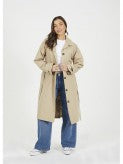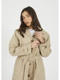 Gabardina larga de mujer con cinturón y cierre de botones. Detalle botón en el puño.