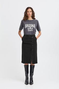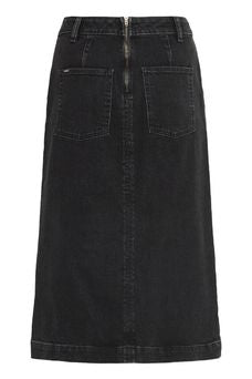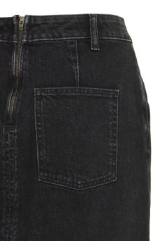 Falda vaquera mido, con bolsillos y detalle de botones en la apertura lateral.